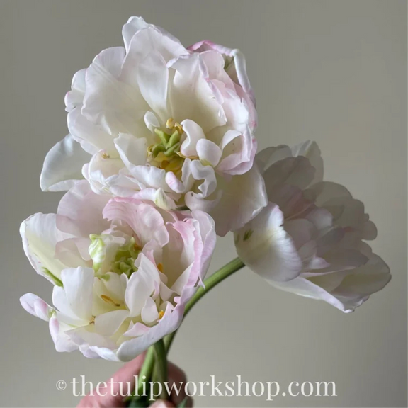 Finola's soft ivory base with green and soft pink striping throughout her petals makes her one of our favourites (yes, we have lots of favourites). She's tall and strong and the perfect tulip for bouquets.